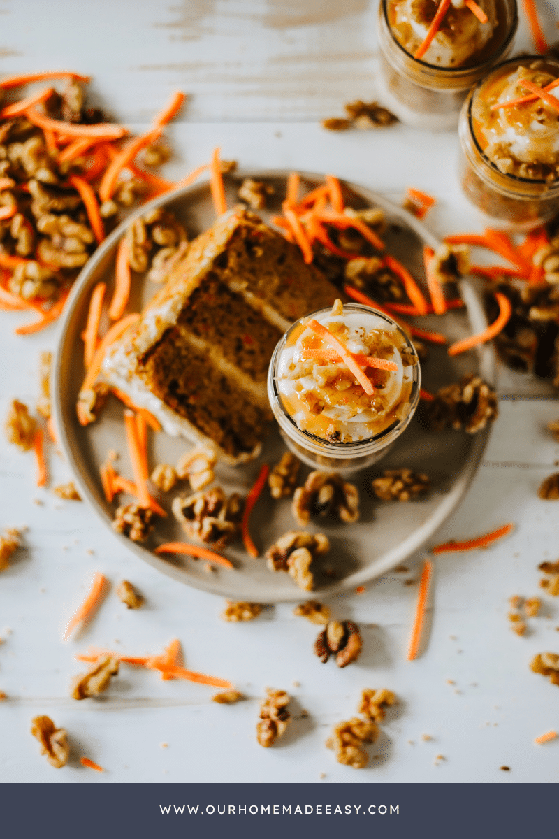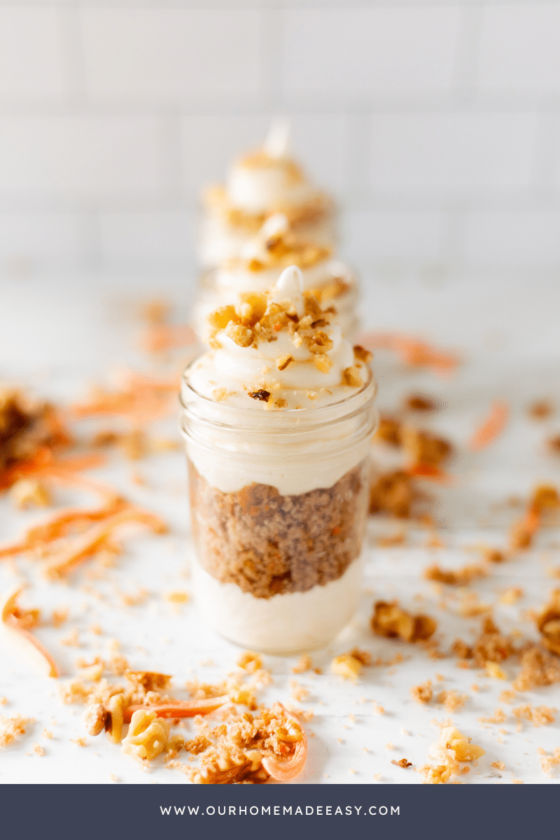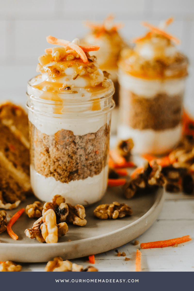 Add the Toppings: Top each jar or the trifle dish with the cream cheese frosting. Sprinkle with crushed walnuts, and shredded carrots. Make it extra decadent and drizzle with caramel syrup!