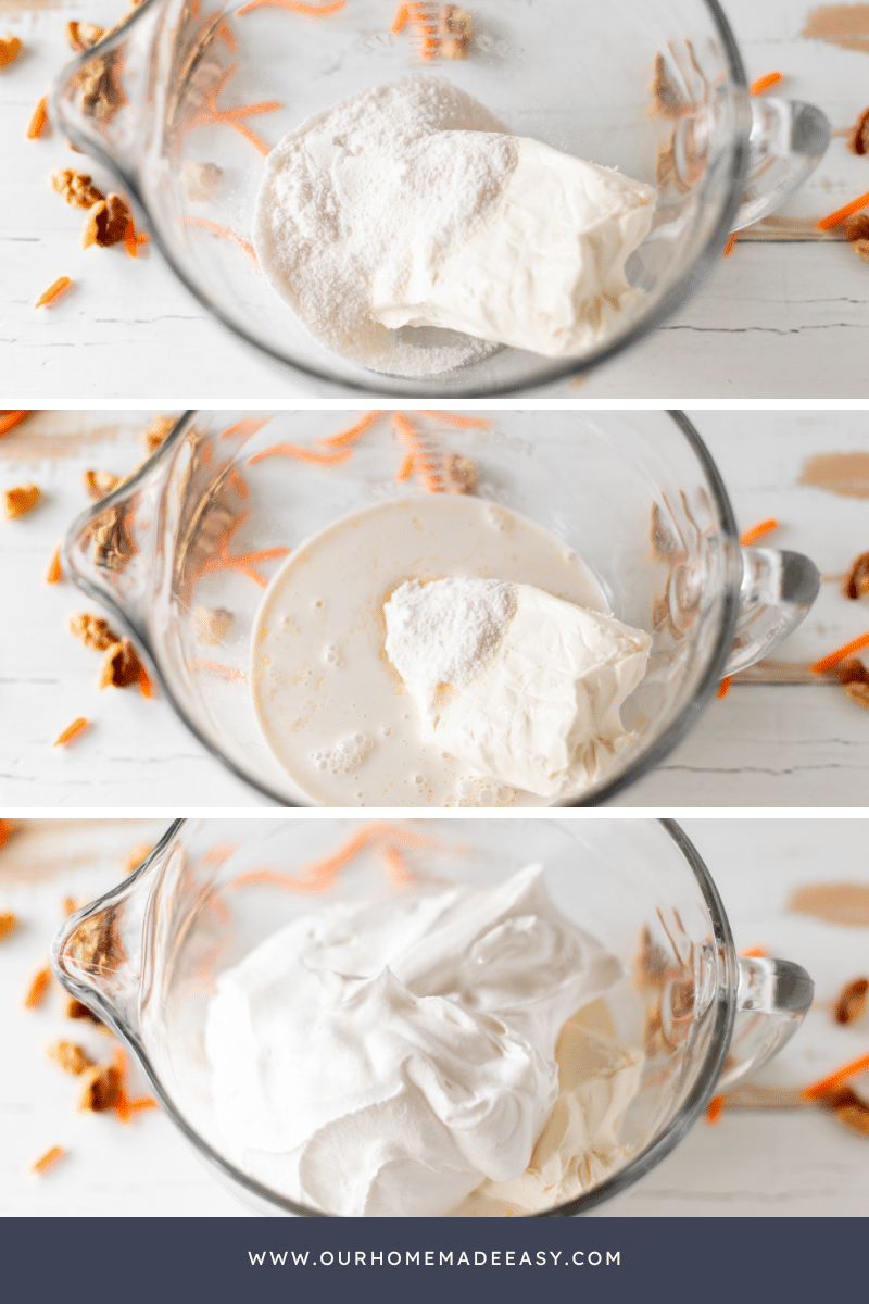 For a Trifle Dish: Spread 1/3 cheesecake mixture into the dish, covering the bottom. Add 1/2 of your crumbled carrot cake, then another 1/3 of the cheesecake mixture. Add a layer of the remaining 1/2 of the carrot cake. Top with the final 1/3 of your cheesecake mixture!