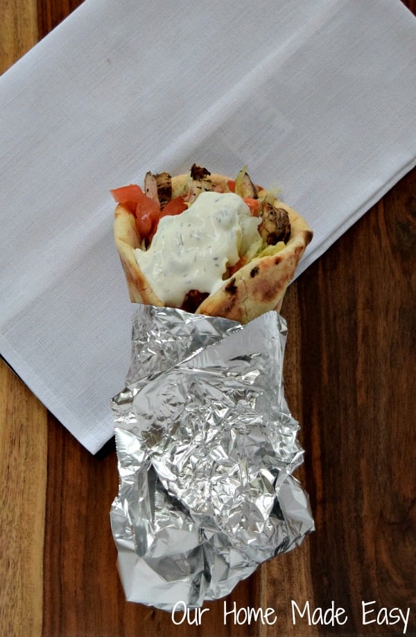 Once the chicken is cooked thoroughly, serve on the pita bread. Top with tzatziki, tomato, lettuce, and red onions. As you can see from these photos, I am not an onion fan. My husband more than happily takes my fair share.