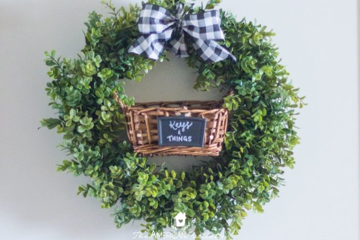 Easy DIY Indoor Farmhouse Boxwood Wreath with Basket for Keys