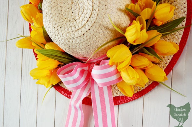 Easy and colorful, this spring wreath is made with a hat and some bright tulips.