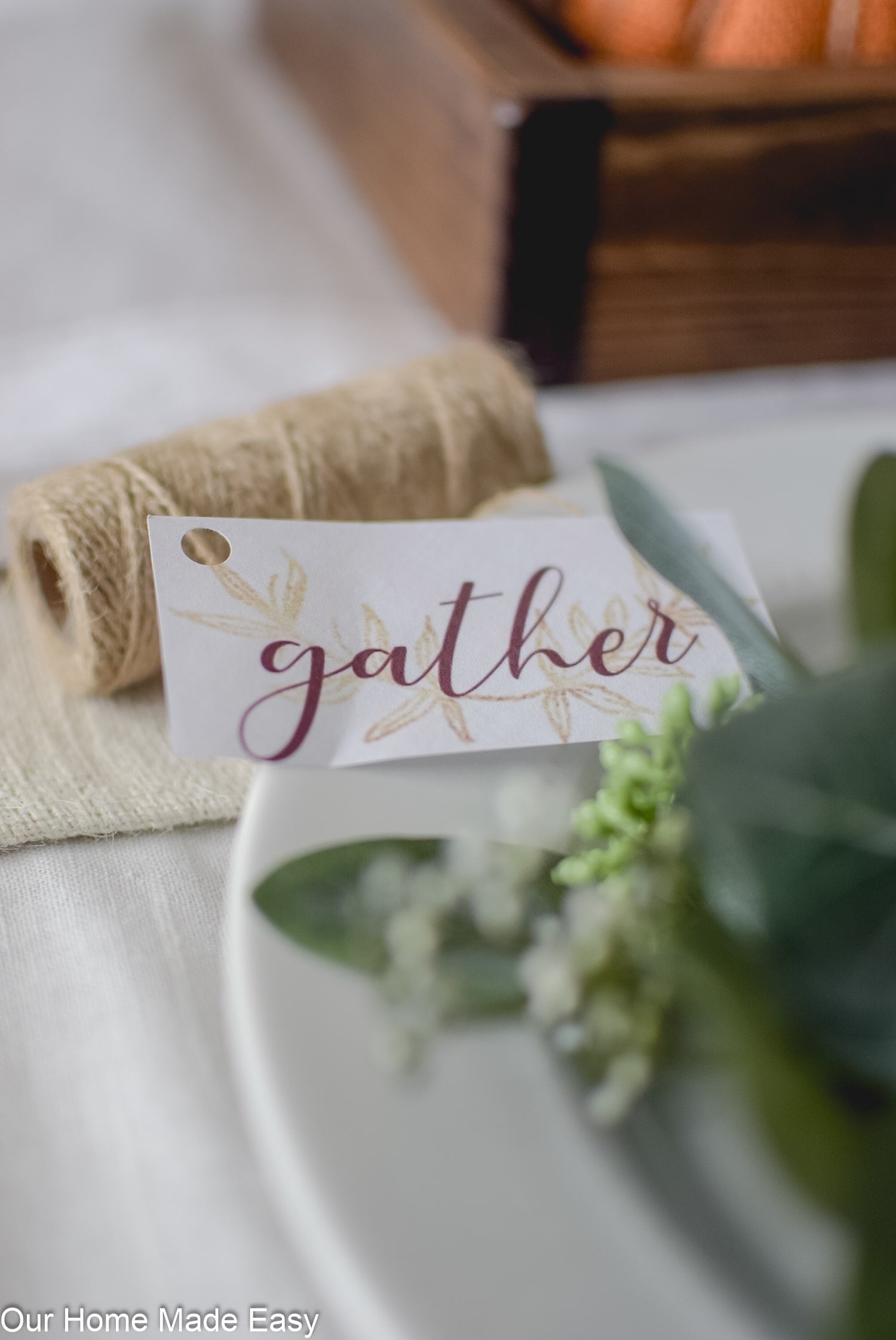 Make your Thanksgiving Table Decorations an easy DIY this year! Avoid spending too much money by using what you have on-hand and printing off a free ‘Gather’ tag.
