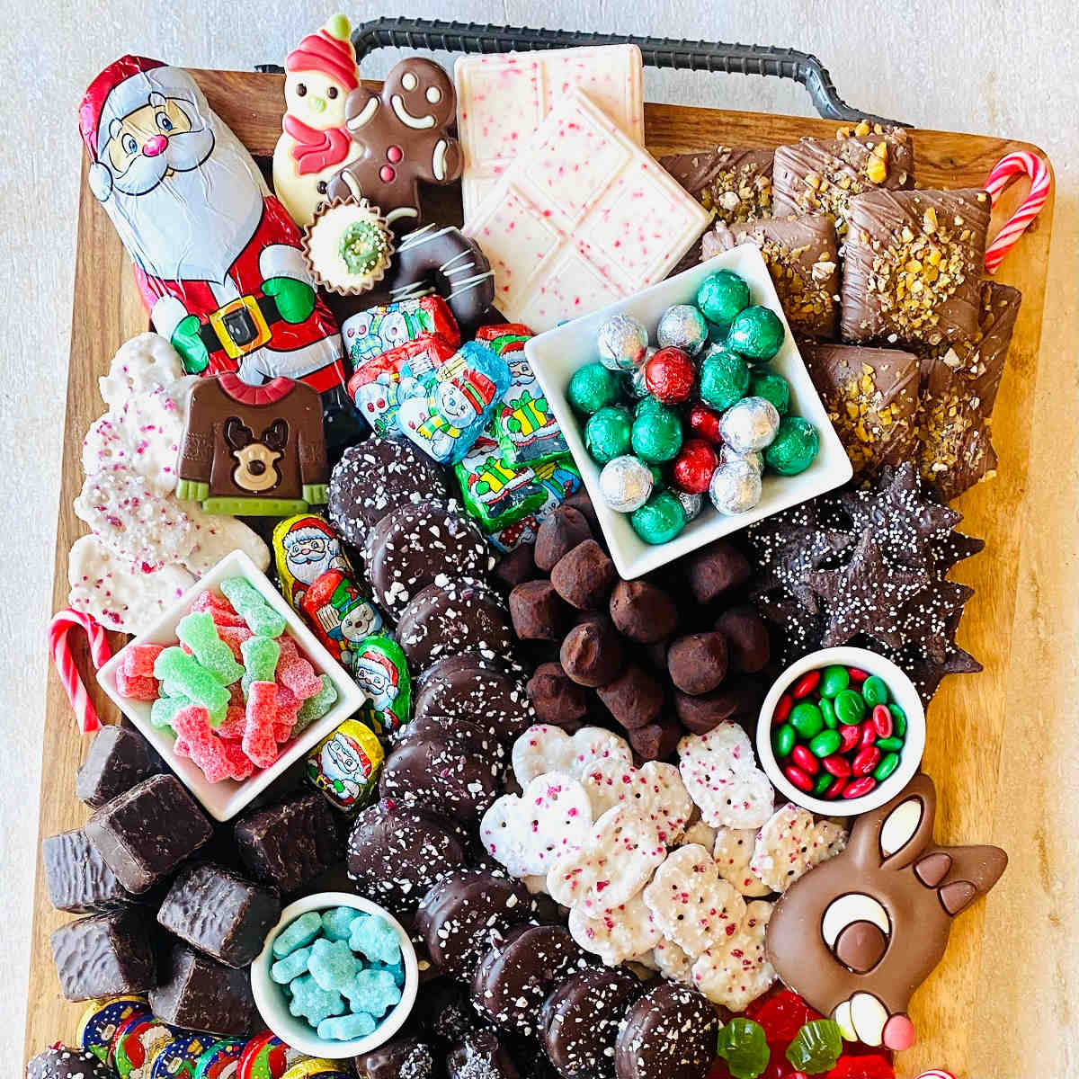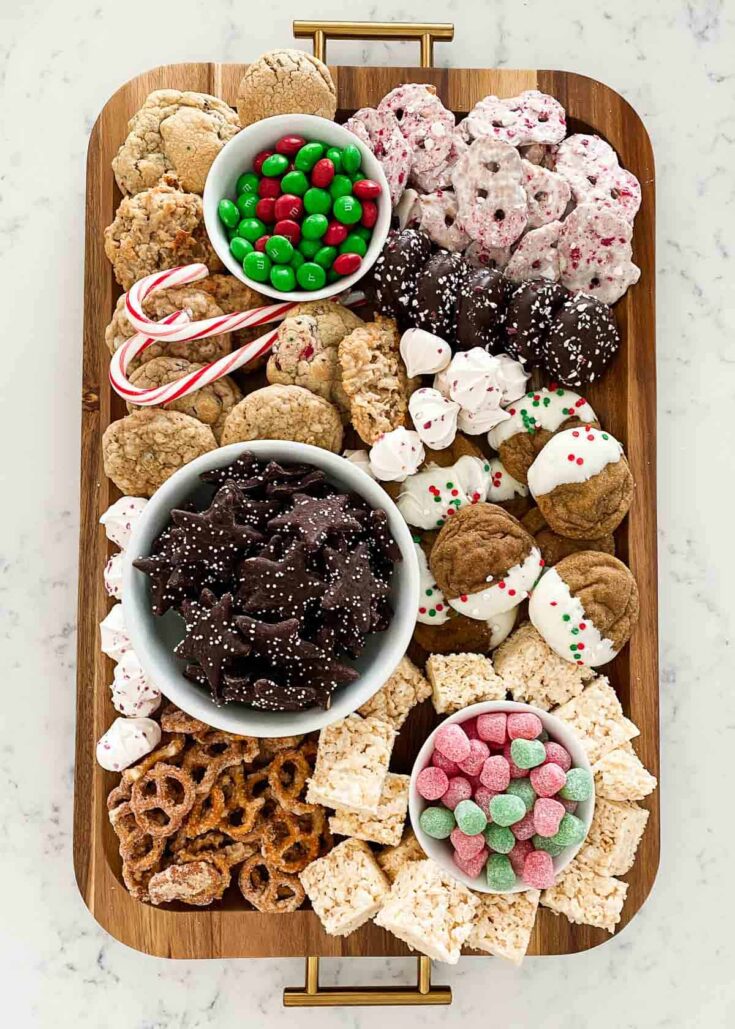 This Christmas dessert board is a festive array of delectable cookies, sweet candies, and chocolates presented on a charcuterie board that will impress guests at any holiday party all season long!