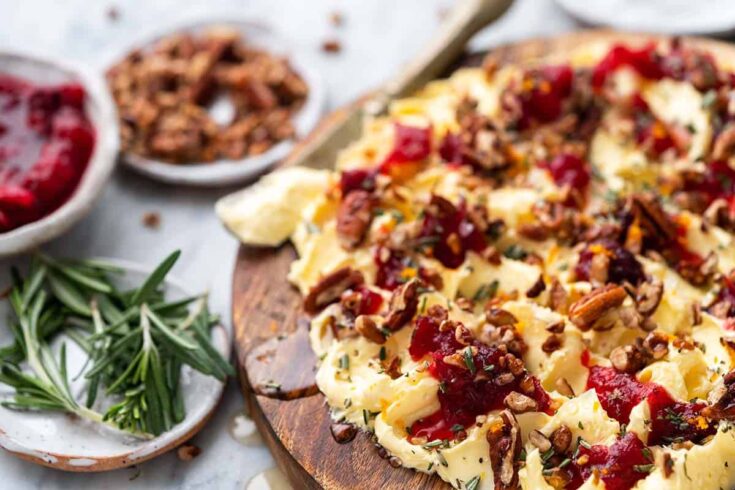 This holiday butter board is perfect for Christmas or Thanksgiving! Here we top decadent swirls of butter with cranberry sauce, pecans, orange zest, and rosemary for a festive flavor profile that’s perfect as a holiday appetizer or brunch.