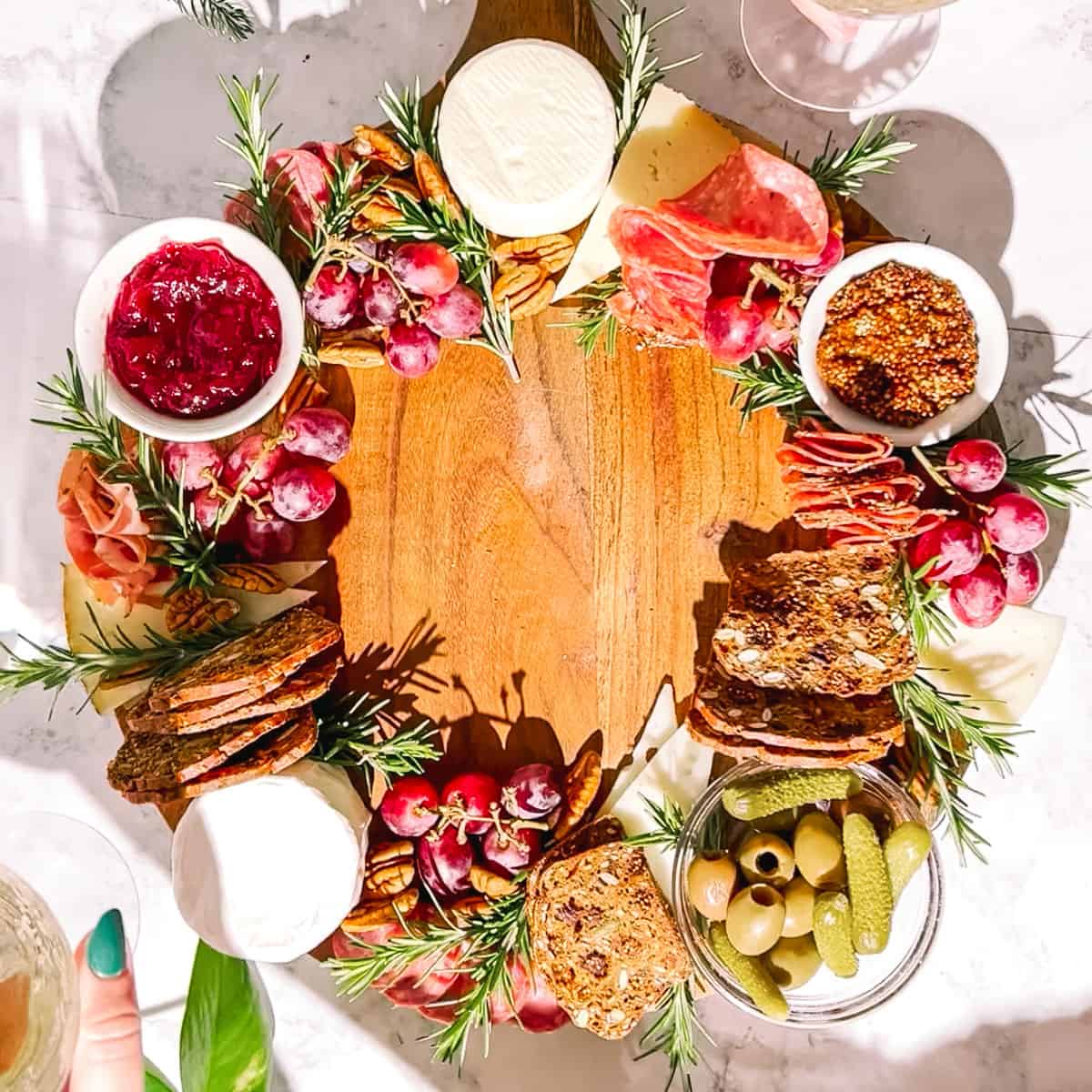 This festive wreath of meats, cheeses, fruits, nuts, and scrummy edibles is a most a delicious way to knock your party out of the park!
