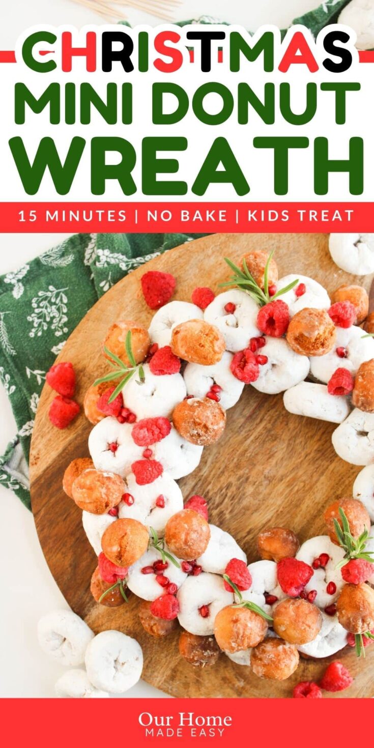 This Christmas wreath using mini donuts is the perfect holiday treat. Quick, no-bake, and festive enough for parties or Christmas morning.