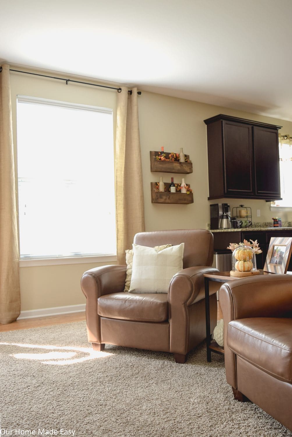 Even the DIY wine rack received some love thanks to dollar store leaf garland. The burlap curtains are still a favorite of mine. I think they add texture, but without a lot of weight. Even though we don’t have a traditional farmhouse, they are still well loved. 🙂