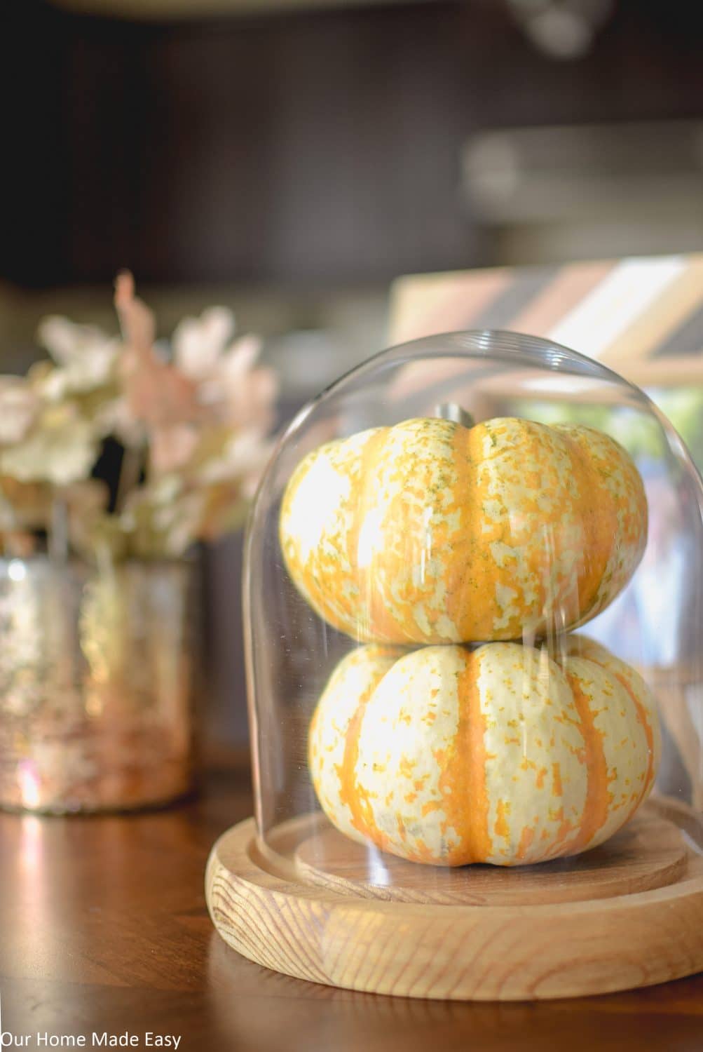 Putting the candles in the basket is the most brilliant thing I’ve seen all day! It looks great and is SO functional. The pumpkins in the cloche are super cute too!